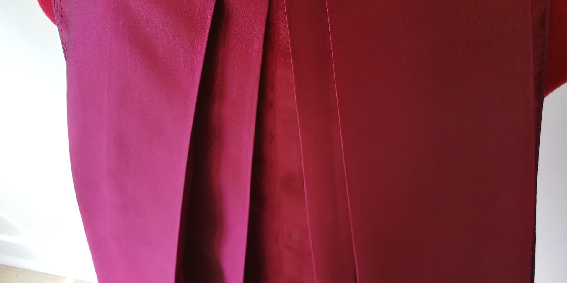 I finished the raw edges of the fabric first using the rolled hem setting on my overlocker/serger. Next I sewed the box pleats, making sure they were even and secure. Afterward, the Velcro strips were carefully sewn along the edges where the train would attach. It was essential to make sure that the Velcro would align perfectly, so the train stayed in place during the performance, but could still be removed effortlessly when needed.