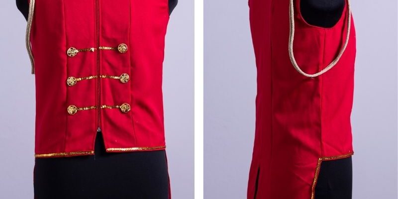 Military jackets are iconic for their million buttons down the front, so we’ll have to add some, even though we’ve added a zipper. To really create a contrast with the red, we’ve decided to use gold sequence and buttons to resemble the military jacket. For an extra detail, we’ve added a circular golden cord around the right shoulder under the epaulet and this all really helped to sell the look and it was striking on stage.